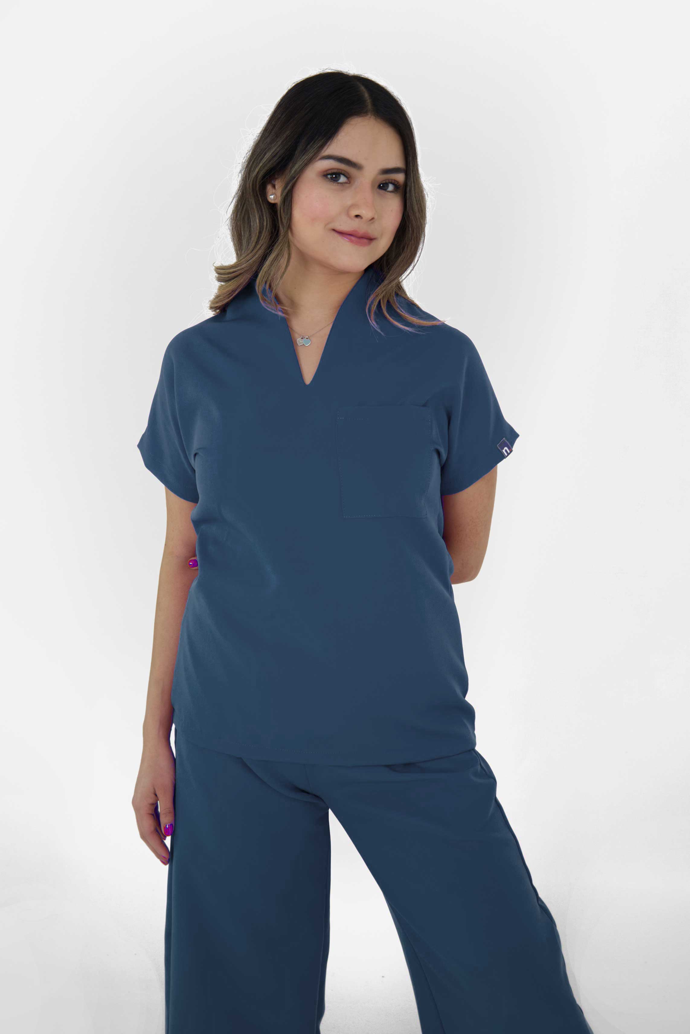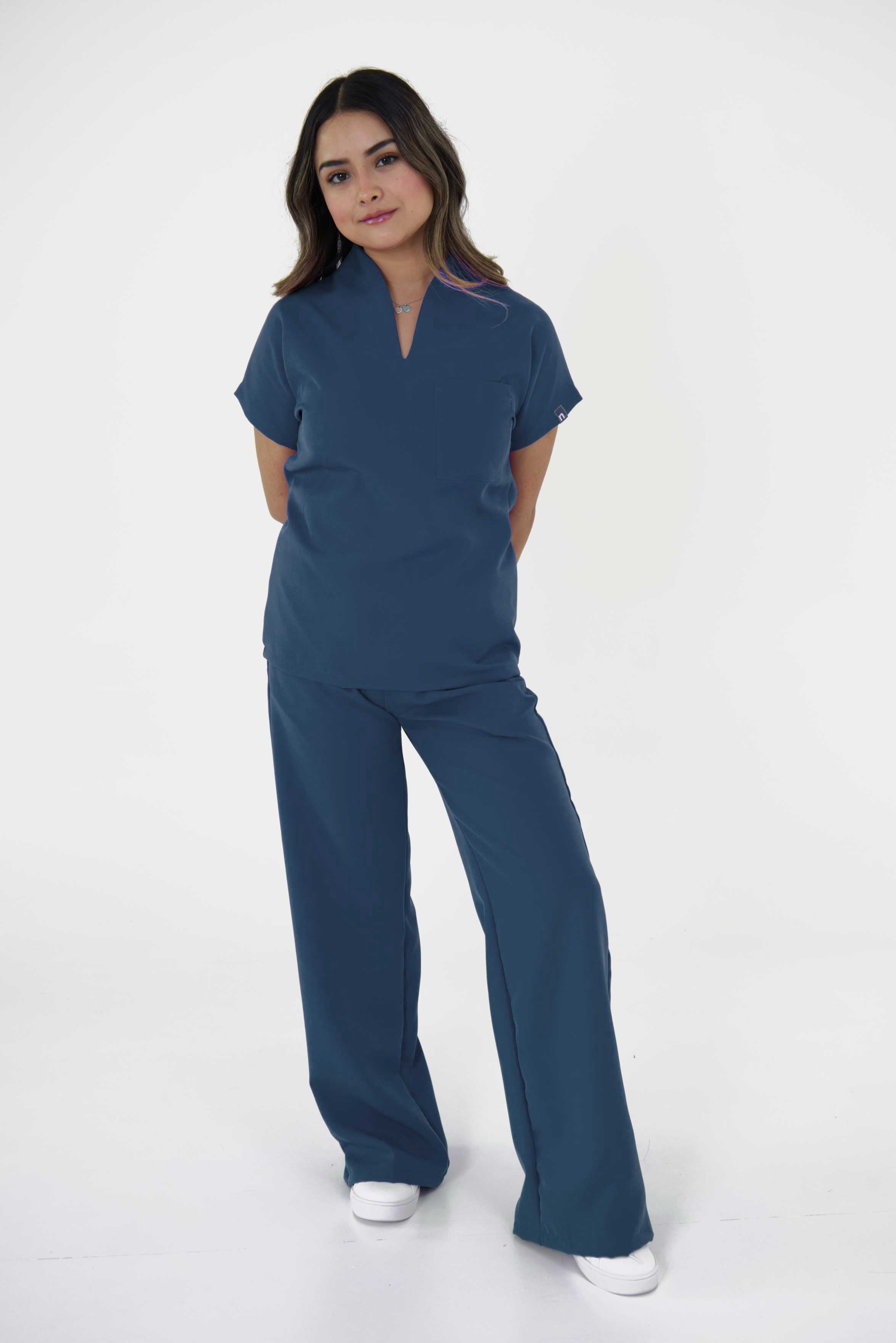 La colección de Uniformes Quirúrgicos Milan es una de las más elegantes del catálogo, la filipina cuenta con un cuello alto en V y una bolsa en el pecho del lado del corazón. El pantalón es ancho, cuenta con 2 bolsas laterales y resorte en la cintura.